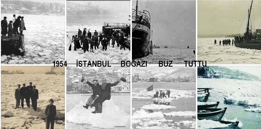 İstanbul Boğazı’nda, kayıtları günümüze dek ulaşmış ilk buzlanma 401’de oldu ve 20 gün sürdü. Boğaz ve Haliç bir çok kez dondu. Sonuncusu 1954’teydi. 23 Şubat 1954 tarihli gazeteler, karın İstanbul’daki hayatı felce uğrattığını yazıyorlardı. Ama ertesin gün olacakları kimse tahmin etmemişti. 24 Şubat’ta Romanya’dan Karadeniz’e dökülen Tuna Nehri’nden koparak gelen buzlar, Boğaz’ın girişini kapladı. Boğaz’daki vapur seferleri iptal edildi. Günler geçtikçe buzlar ilerledi; Üsküdar, Haydarpaşa derken Marmara Denizi’ne geçmeye başladı. Buzların üstüne çıkmak yasaklandı. İstanbul halkı kıyılarda toplandı, bol bol hatıra fotoğrafı çektirdi. Daha cesur olanlar ise buzların üstüne çıktılar, kimileri bayrak dikti, kimileri de kolkola girerek poz verdi. 6 Mart’ta havaların ısınmasıyla buzlar erimeye başladı ve İstanbul’un çetin kışından geriye anılar ve fotoğraflar kaldı…