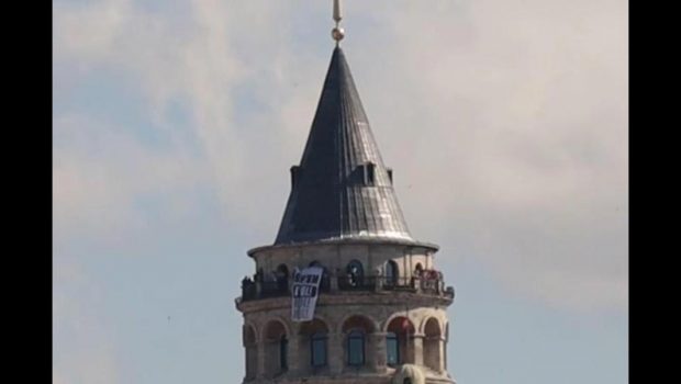 Galata Kulesi’ne “Kayyum defol” pankartı