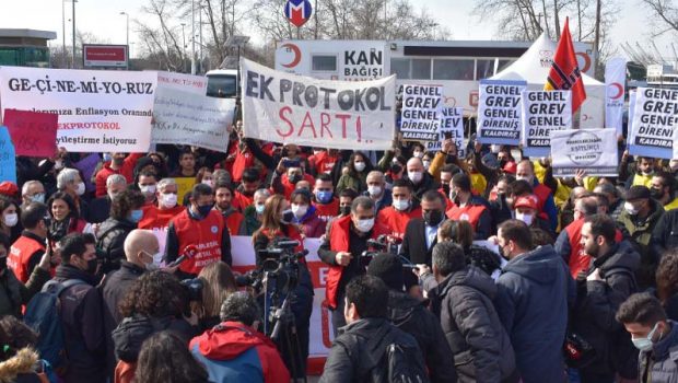 DİSK Genel Başkanı Arzu Çerkezoğlu, DİSK’e bağlı sendikaların üye ve yöneticileri, direnişteki Farplas işçileri ve çok sayıda kişinin katılımıyla düzenlenen açıklamada, “Hayat pahalı emek ucuz bu böyle gitmez” pankartı açıldı; “Genel grev genel direniş”, “Ek protokol şart”, “Eriyen maaşlara iyileştirme istiyoruz” dövizleri taşındı.
