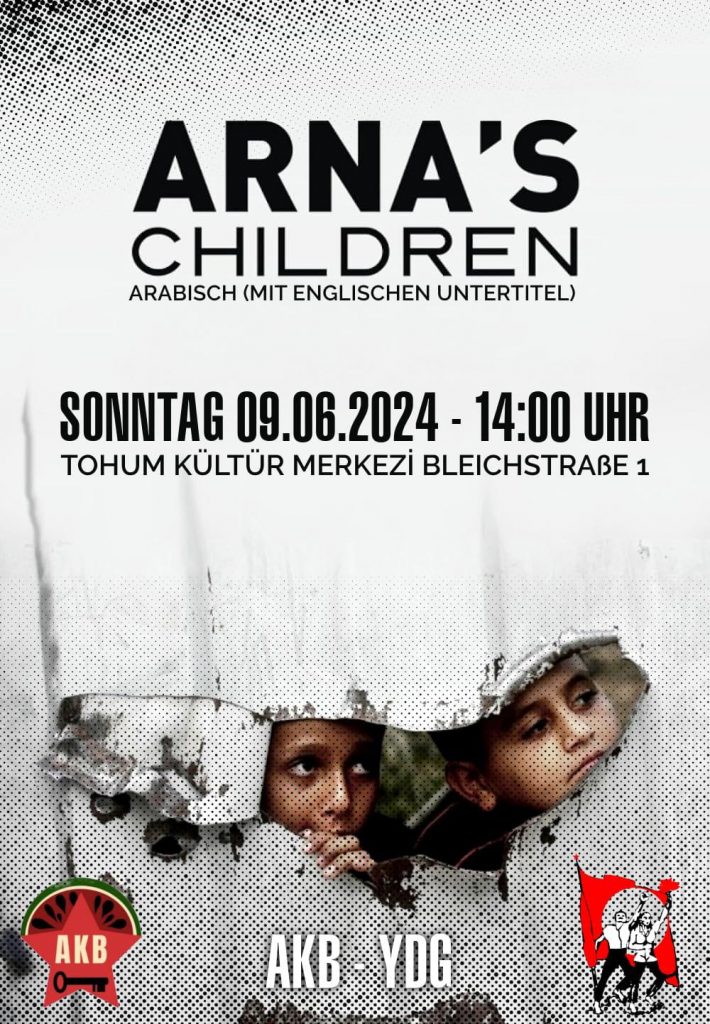 Anti-Sömürgeci Birlik (AKB) ve Yeni Demokratik Gençlik (YDG) olarak Güney Almanya’da bulunan Ulm Tohum Kültür Merkezi’nde “Arna’nın Çocukları (2004)” belgesel-film gösterildi. Film, Jenin’deki bir eğitim programında yer alan Filistinli çocukları konu alıyor.