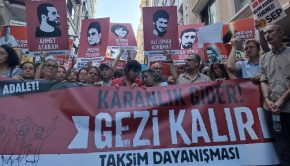 Gezi direnişinin 9. yılında Taksim’de TMMOB önünde toplanan kitle Gezi’de ölümsüzleşenleri andı. Gezi davasında tutsak edilenler için adalet talebinde bulunan