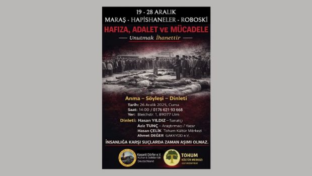 19–28 Aralık tarihleri arasında gerçekleştirilecek anma etkinlikleri kapsamında, Almanya’nın Ulm kentinde dikkat çeken bir buluşma organize ediliyor. Maraş, 12 Eylül cezaevleri ve Roboski katliamları gibi Türkiye yakın tarihinin en karanlık sayfalarını hatırlatmayı amaçlayan etkinlik, “Hafıza, Adalet ve Mücadele – Unutmak İhanettir” çağrısıyla gerçekleştiriliyor.