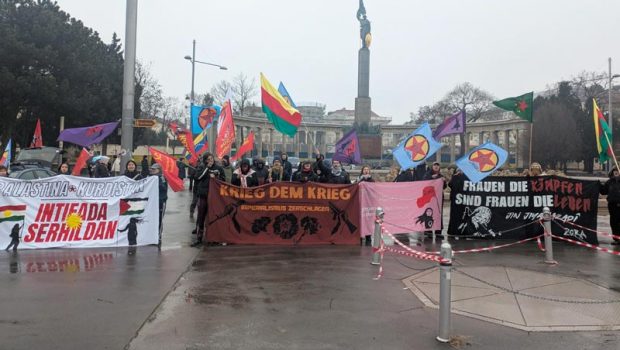“Ancak bugün burada toplanan insanlar emperyalistlerin amaçların ulaşamayacaklarını yüzlerini Kobanê’ye çevirerek gösteriyorlar. Bugün burada olan işçiler, gençler, kadınlar, LGBTİ+’ların tek bir amacı var o da Rojava devrimini nerede olursak olalım savunmak. Dünyadaki halkların özgürlüğü için nerede bir mücadele varsa orada olmalıyız. Eğer ABD emperyalizmi halkları savaşlara itiyorsa buna karşı çıkmalıyız; İsrail’in Rojava’daki katliamdaki ortaklığına, HTŞ’nin saldırılarına karşı direnmeliyiz, çünkü yaşamak direnmektir!”