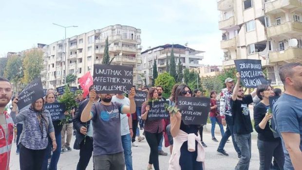 Hatay’da Sosyete Pazarı’nda buluşan depremzedeler, Sevgi Parkı’na yürüyüş gerçekleştirdi.