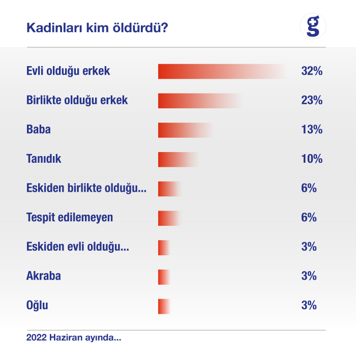 Kadınlar yine en yakınları tarafından öldürüldü. Haziran ayında öldürülen 31 kadının onu evli olduğu erkek, ikisi eskiden birlikte olduğu erkek, yedisi birlikte olduğu erkek, biri eskiden evli olduğu erkek, biri oğlu, dördü babası, biri akrabası ve üçü de tanıdığı bir erkek tarafından öldürüldü. İkisinin ise faille yakınlığı tespit edilemedi.