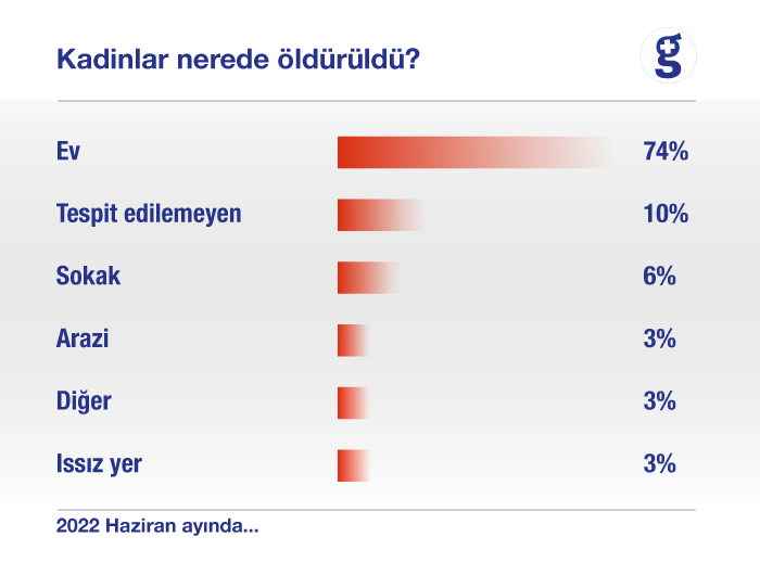 Geçtiğimiz ayki kadın cinayetlerinin büyük bölümü evlerde işlendi. Kadınların 23’ü evinde öldürüldü. Bu da geçen ayki tüm kadın cinayetlerinin yüzde 74’üne denk geliyor.
