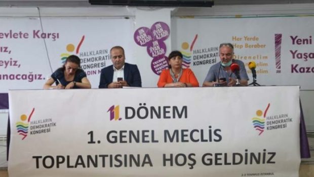 Halkların Demokratik Kongresi (HDK), 11’inci Dönem Genel Meclis toplantısını Halkların Demokratik Partisi (HDP) Bağcılar İlçe Örgütü’nün konferans salonunda düzendi. “Erkek devlete karşı buradayız, direnişteyiz, bir aradayız”, “Yeni yaşam kazanacak” ve “Bi biryarî ya şehîdên şoreşê emê serkevin” pankartının asıldığı salona, HDK Eşsözcüleri Esengül Demir ve Cengiz Çiçek, HDK eski Eşsözcüsü Sedat Şenoğlu, HDP İstanbul Milletvekili Musa Piroğlu ve çok sayıda kişi katıldı.