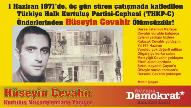 1 Haziran 1971’de, üç gün süren çatışmada katledilen Türkiye Halk Kurtuluş Partisi-Cephesi (THKP-C) Önderlerinden Hüseyin Cevahir Ölümsüzdür!