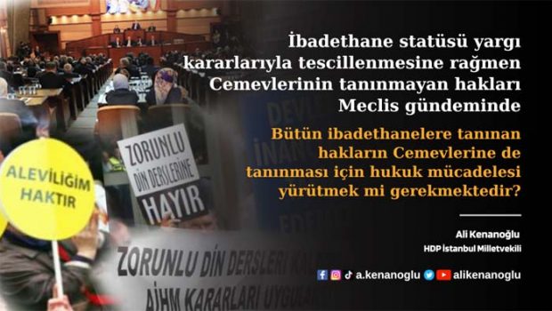 Halkların Demokratik Partisi (HDP) İstanbul Milletvekili Ali Kenanoğlu, Cemevlerinin ibadethane statüsüne yönelik emsal yargı kararlarını hatırlatarak Cemevlerine verilmeyen hakları Meclis gündemine taşıdı.