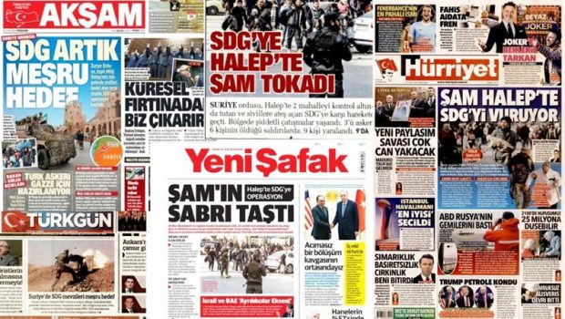 Yeni Şafak: Manşetten gördüğü haberde, “Suriye’nin sabrı taştı” başlığı ile servis ederken, haberin içeriğinde QSD’nin Halep’teki sivilleri İHA, top atışları ve füzelerle vurduğunu öne sürdü. QSD’nin, 10 Mart Mutabakatı”na uymadığı ve kendini fesih etmediği belirtilen haberde, QSD’ye dönük saldırıları “meşru” gördü.