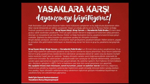 Biz aşağıda imzası olan müzisyen, sanat kurumları, yazar ve aydınlar olarak halkımıza, doğamıza, kültürümüze yönelik bu topyekûn saldırılardan hiçbirimizin azade olmadığı bilinciyle bütün sanatçı dostlarımızı yasakçı, faşist zihniyetin saldırılarına karşı sanatımızın toplumsal gücüyle mücadeleyi büyütmeye ve yasaklara karşı ses yükseltmeye çağırıyoruz.