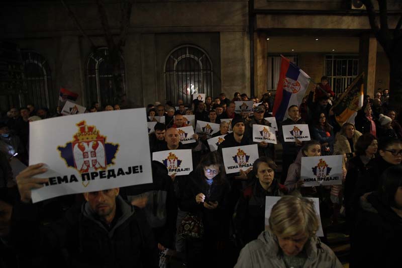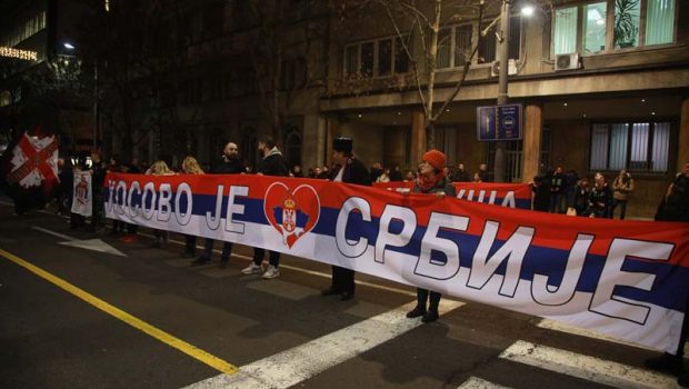 Başkentteki Cumhurbaşkanlığı binası önünde toplanan yüzlerce kişi, Kosova’nın kuzeyinde 7 gündür nöbet tutan Kosovalı Sırplara dayanışma mesajı gönderdi.
