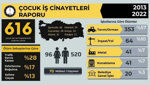 Buna göre, 2013-2022 yılları arasında hayatını kaybeden çocukların 211’i 14 yaş ve altında, 405’i ise 15-17 yaş grubundaydı.