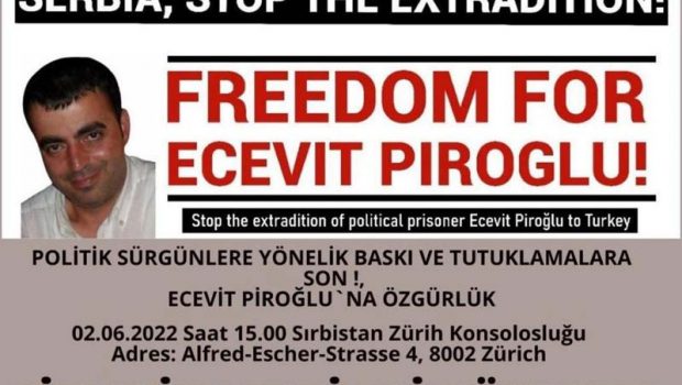 Devrimci siyasetçi Ecevit Piroğlu’nun Sırbistan hükümetinin Türkiye’ye iade etmek istemesine yönelik tepkiler büyüyor. İsviçre’nin Bern ve Cenevre kentleri ile Almanya’nın Köln, Frankfurt ve Stutgart kentlerinde eylemler düzenlendi. ADGB bileşenleri bugün de Zürih, Atina ve Paris’te düzenleyecekleri eylemlerle Piroğlu’nun bir an önce serbest bırakılmasını talep edecek.