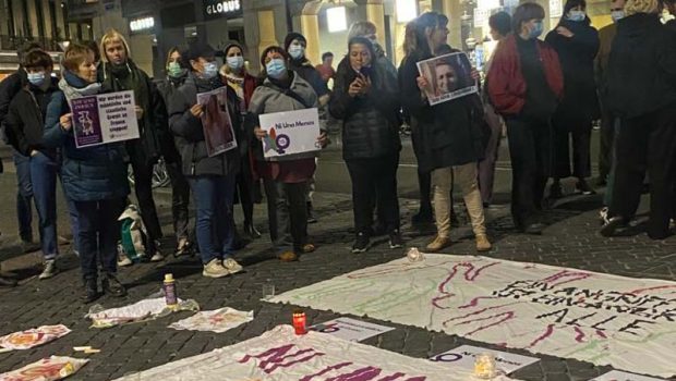 Basel’de parlamento binası önünde yapılan eylemde, 14 Ekim’de Zürih’de katledilen Türkiye’li Fulya Demir’in bir akrabası konuşma yaptı. Fulya’nın evli olduğu erkek tarafından katledildiği anlatılan konuşmada, katil erkeğin bir hafta önce cezaevinden çıktığı, uzaklaştırma kararı olduğu halde katliam gerçekleştiği aktarıldı.