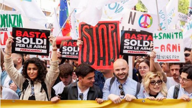 M5S kaynaklarına göre, AB’nin yeniden silahlanma planına karşı düzenlenen yürüyüşe 80 binin üzerinde kişi katıldı.