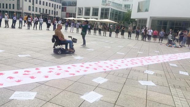 “Istanbul-Konvention rettet Leben!” (İstanbul Sözleşmesi Yaşatır) mottosuyla gerçekleştirilen eylemde, bu sloganın harflerini 31 kadın tuttu ve üzerinde “302 kanlı el izi” görselinin bulunduğu şerit şeklindeki büyük bir beyaz pankart alana serildi. Her el, katledilen 302 kadını simgeledi.