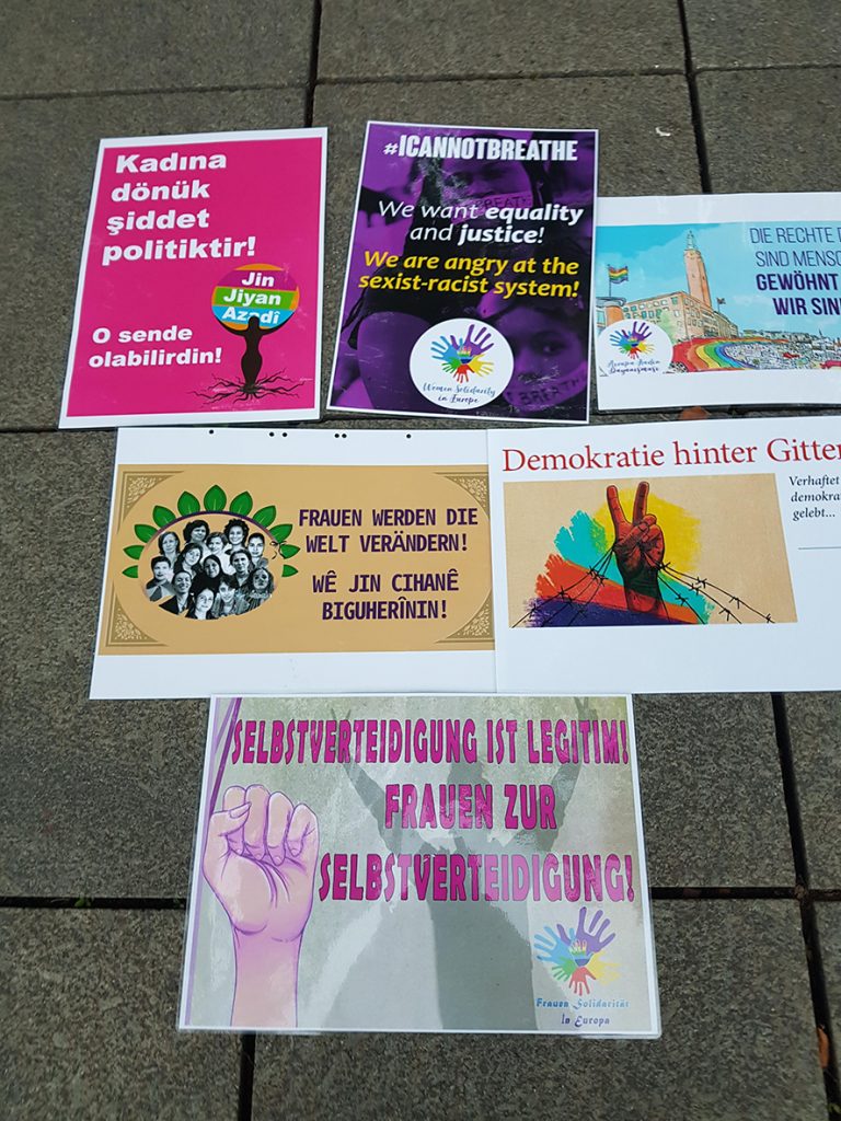 Miting alanında, kadın cinayet, tecavüzlerine dair ve özgürlüğünü talep eden birçok poster sergilendi. TJK-E’nin Türkiye’deki kadın tecavüz ve katliamlarına dair Almanca yazılı el ilanları kent sakinlerine dağıtıldı. Mitinge özellikle kadınların ilgisi büyük oldu. Miting aktivistleriyle kent sakinleri arasında yapılan sohbetlerde hem Türkiye’deki kadın cinayet ve tecavüzlerine hem de Kürdistan bölgelerine yapılan savaş konuşulup, kınandı. Sıklıkla, ’Sara, Rojbin, Ronahi – Jin Jiyan Azadi!’’, ‘’Yaşasın enternasyonal dayanışma’’, ‘’Diktatör Erdoğan! ‘’vb. sloganlar söylendi.