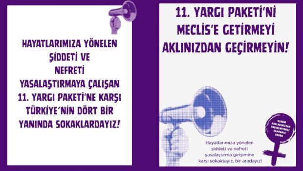 11. Yargı paketiyle LGBTİ+’ların hedef alınmasına karşı kadınlar çok sayıda kentte sokaklara çıkacak. Kadınlar, “11. Yargı Paketi’ni Meclis’e getirmeyi aklınızdan bile geçirmeyin” diyerek, yasa tasarısının geri çekilmesini isteyecek.