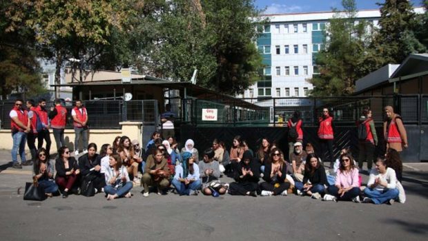 Kadınlar polisin engellemesini oturma eylemi ile protesto etti. Oturma eyleminde, “Kadınlara değil İsrail’e barikat”, “Kadınlar savaş istemiyor” ve “Jin, jiyan, azadî” sloganları atıldı.
