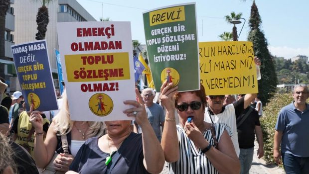 İzmir’de binlerce kamu emekçisi, hükümetin düşük zam teklifine karşı bir günlük iş bırakma eylemi yaptı. Yapılan açıklamada, “Bu tablo müzakereyle değil, mücadeleyle değişir” denildi.