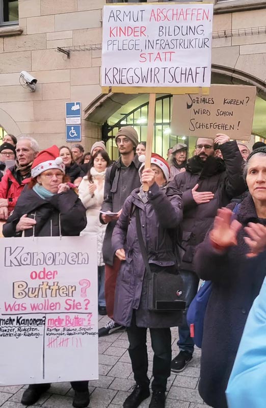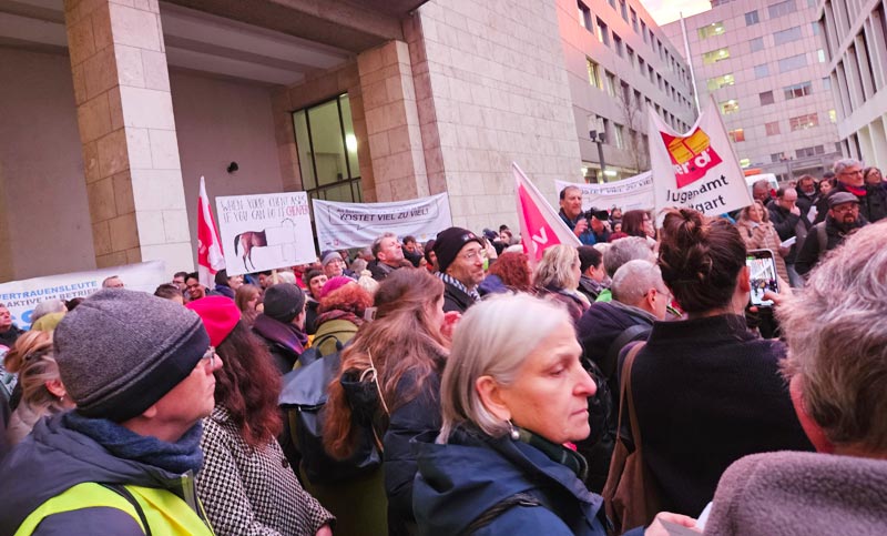 Stuttgart’ta onlarca kişi 19 Aralık sabahı belediye binası önünde bir araya gelerek kültür, eğitim ve sosyal hizmetlerdeki kesintilere karşı ses yükseltti. Eylemciler, büyük şehirler düzeyinde bir ticaret vergisi artışıyla bu alanlardaki kesintilerin durdurulabileceğini vurguladı.