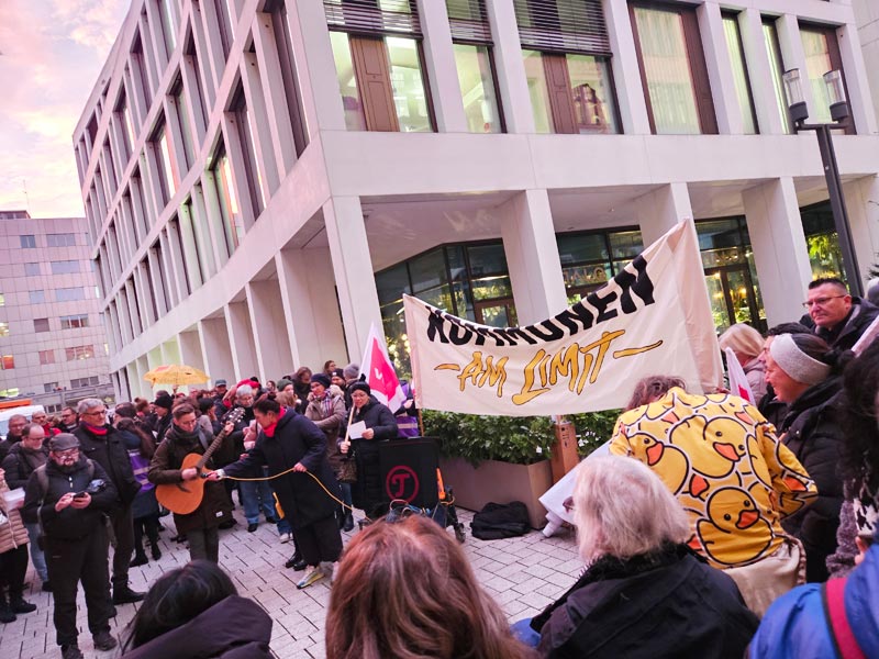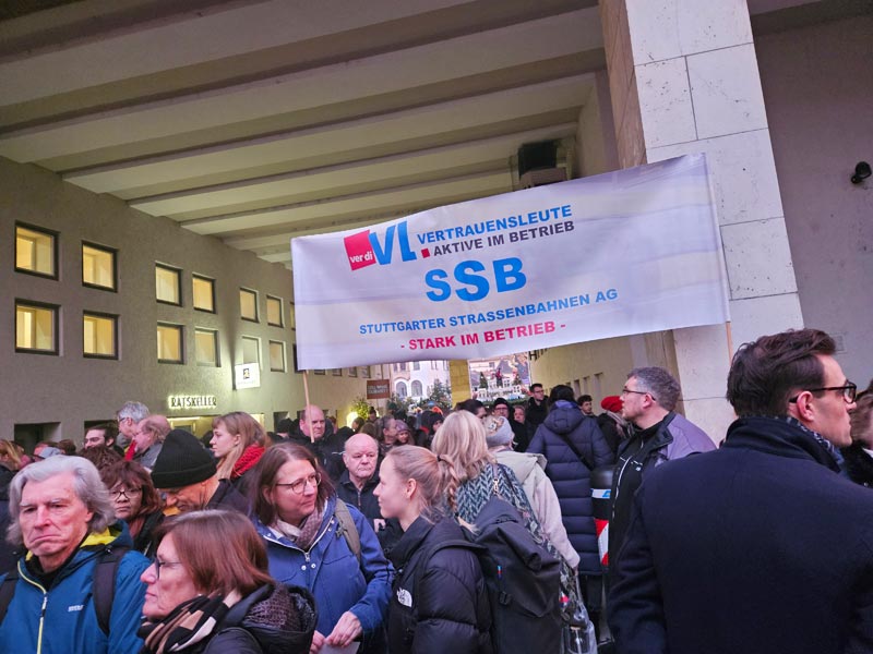 Stuttgart Belediyesi’nin 2026 bütçesini oyladığı 19 Aralık sabahı, çok sayıda kişi Rathaus (Belediye) önünde toplanarak kamu hizmetlerinde öngörülen kesintilere karşı bir protesto düzenledi. Soğuk havaya rağmen erken saatlerde bir araya gelen eylemciler, “Gewerbesteuer erhöhen = Keine Kürzungen in Kultur, Bildung und Sozialem” (Ticaret vergisini artır = Kültür, eğitim ve sosyal alanlarda kesinti olmasın) pankartıyla taleplerini görünür kıldı.