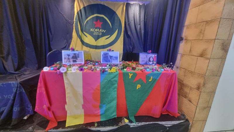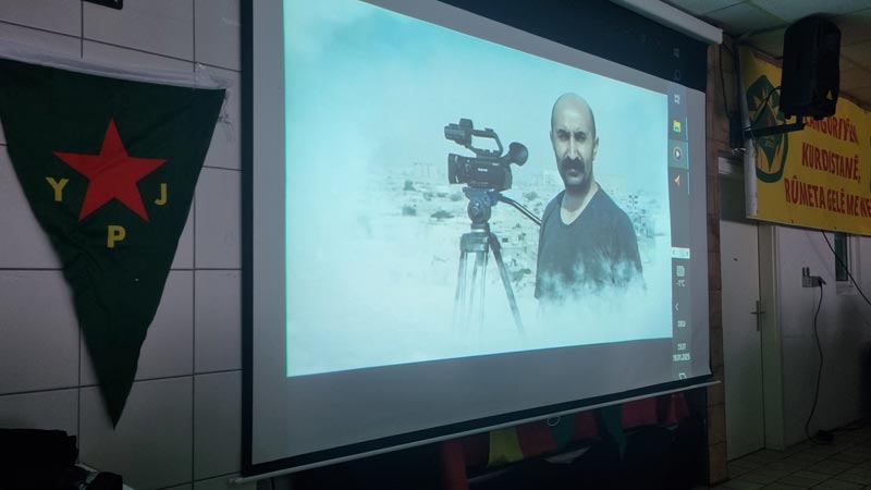 Eylem alanına, yaşamını yitiren gazetecilerin fotoğraflarının yanı sıra Rojava Devrimi’ne dikkat çeken pankartlar, YPG-YPJ bayrakları ve Abdullah Öcalan’ın fotoğraflarının yer aldığı flamalar asıldı.