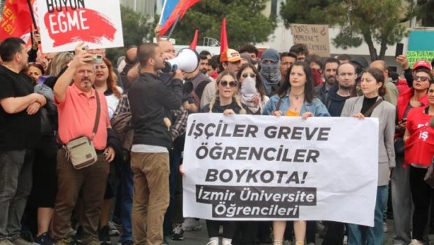 İzmir’de iş bırakma eylemi yapan DİSK ve KESK’e bağlı işçiler, “Emekçilerden, emeklilerden, gençlerden, kadınlardan kısacası halktan büyük bir güç yok” dedi.