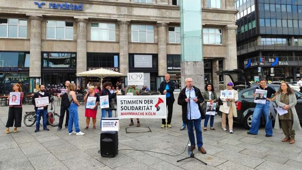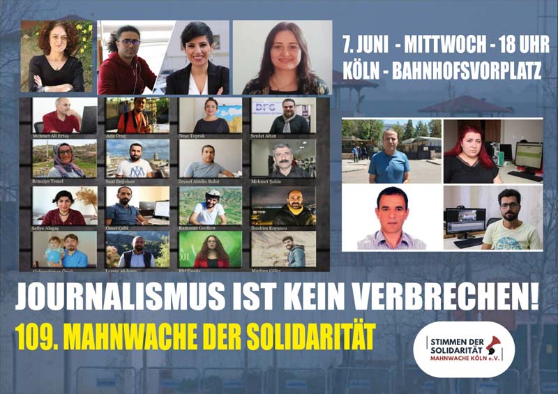 Köln’de tutsak gazeteciler ve siyasi tutsak Alman vatandaşları ile dayanışma çalışması yürüten Dayanışmanın Sesi Derneği, 109. Adalet Nöbeti eylemini düzenledi.