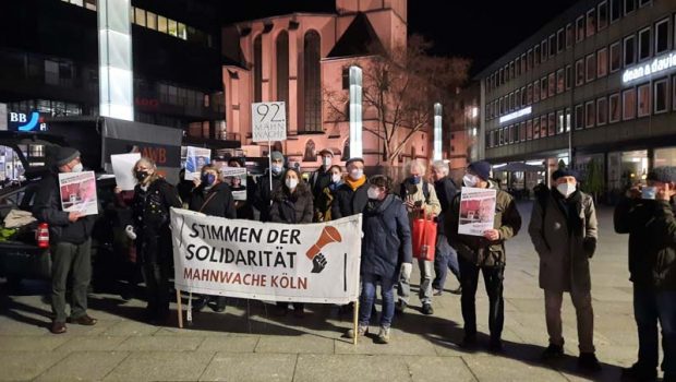 Dayanışmanın Sesi Derneği’nin Almanya’nın Köln kentinde gerçekleştirdiği “92. Adalet Nöbeti’ eyleminde, Türkiye’de yurtdışı yasağından geri dönemeyen Alman vatandaşları Mahmut Güneş ile tutuklu Patrick Kraicker ve Iran`da tutuklu Nahid Taghavi’nin durumuna dikkat çekti.