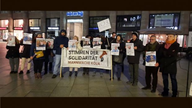 Dayanışmanın Sesi Derneği (Stimmen der Solidaritat), Türkiye’deki siyasi tutsaklar, gazeteciler ve tutuklu Alman vatandaşlarına özgürlük talebiyle 103. Adalet Nöbeti’ni gerçekleştirdi. Köln Merkezi Tren İstasyonu önünde yapılan Adalet Nöbetinde bu ay Türkiye’deki hasta tutsakların durumuna dikkat çekildi.