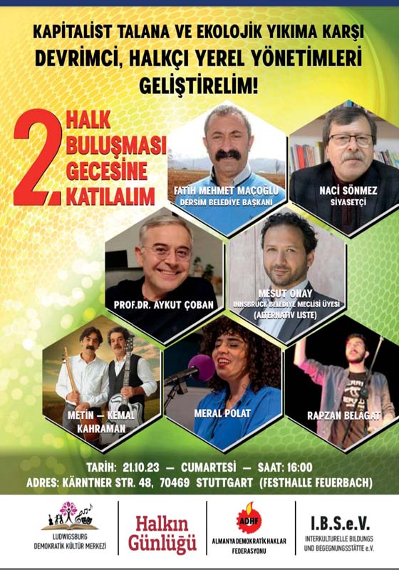 Etkinlik “21 Ekim 2023 Stuttgart-Feuerbach da, kapitalist talana ve ekolojik yıkıma karşı, devrimci,halkçı yerel yönetimleri geliştirelim etkinliğinde buluşmak üzere ..” çağrısı da yapıldı.