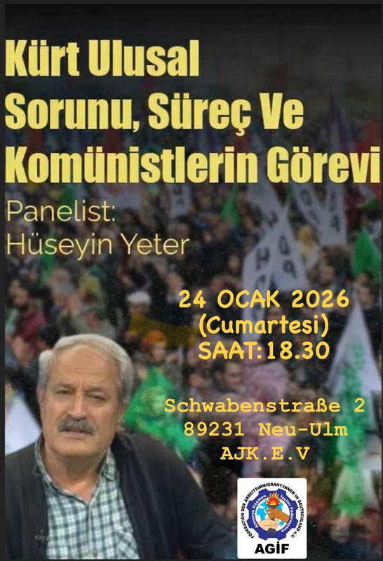 Almanya’nın Neu-Ulm kentinde 24 Ocak Cumartesi günü düzenlenen “Kürt Ulusal Sorunu, Süreç ve Komünistlerin Görevi” başlıklı panel, politik içerikleri ve canlı tartışmalarıyla dikkat çekti. AVEG-KON’a bağlı AGİF’in çağrısıyla gerçekleştirilen etkinlikte panelist olarak yer alan sosyalist yazar Hüseyin Yeter, konuya ilişkin daha önce yazılarında ve Avrupa’nın çeşitli kentlerinde katıldığı etkinliklerde de dile getirdiği temel görüşlerini, aktüel durum ve gelişmelere göre bu kez Neu-Ulm’da paylaştı.