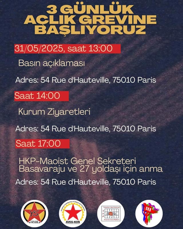 Komite 3 gün sürecek dayanışma açlık grevine tüm Türkiyeli ve Kürdistanlı göçmen emekçileri, enternasyonalist devrimci ve mücadele güçlerini duyarlı olmaya tutsakların direnişine destek vermeye çağırdı.