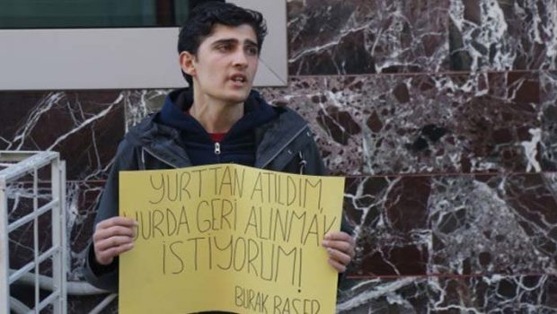 Üniversite öğrencisi Burak Başer, Kredi ve Yurtlar Kurumu’nda (KYK) kalırken bir aylık yurt parasını ödeyemediği için yurttan atıldı. Yurt önünde oturma eylemine başlayan Başer, “850 lira kredi alıyorum, 375 TL’sini yurda veriyorum. 400-500 lira ile ihtiyaçlarımızı karşılamamız bekleniyor” dedi.