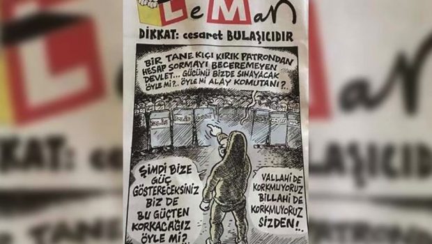 Karikatür dergisi LeMan bu haftaki sayısında Soma’da 8 yıldır tazminatları ödenmeyen maden işçilerinin gözaltına alınmasını eleştiren Kamil Kartal’ın “Öyle mi alay komutanı” sözlerini kapağına taşıdı.