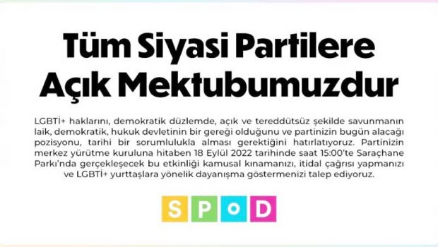 SPoD, 18 Eylül’de Saraçhane Parkı’nda düzenlenmesi planlanan LGBTİ+ karşıtı yürüyüşle ilgili siyasi partilere LGBTİ+’larla dayanışma çağrısında bulundu.