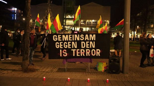 7 Kasım 2020 Cumartesi Günü Kon-Med Manheim/Ludwigshafen örgütünün çağrısıyla akşam saatlerinde Mahheim Paradeplatz Meydanı’ında bir araya gelen kitle İŞİD terör saldırısı kurbanlarını anarak saldırıları protesto etti. Terör saldırısında hayatını kaybedenler için yapılan saygı duruşuyla başlayan anma programında, KON-MED ve İlticacılara Yardım ve sınırdışı uygulamalarına karşı dayanışma örgütü olan “Bundnis gegen Abschiebungen (BgA)” adına yapılan konuşmalarda ”Erdoğan’ın Avrupa’ya yönelik nefret söylemi ve bir süredir dünyanın dört bir yanında cihatçıları harekete geçirmesine dikkat çekilerek, Almanya Federal hükümetinin, Erdoğan’ın rejimini milyarlarca Euro aktarmak suretiyle desteklemesi ve silah anlaşmalarının son buluması istendi. Ve tüm Avrupa ülkelerinin Erdoğan rejimine yönelik sert yaptırımlar uygulaması çağrısında bulunuldu.