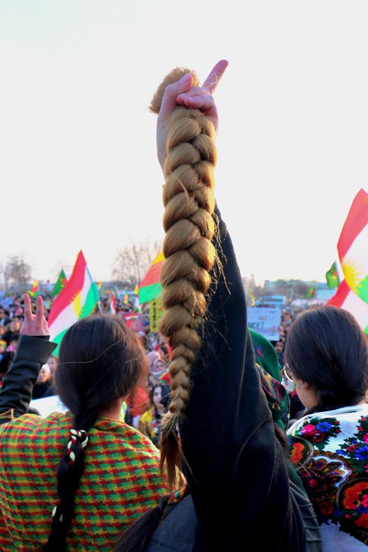 Colani liderliğindeki DAİŞ-HTŞ saldırılarının protesto edildiği eylem boyunca, Kobanê kuşatmasında yaşamını yitiren çocukların ve YPG’lilerin fotoğrafları taşındı. Mitingde kadınların yoğun katılımı dikkat çekerken, toplu saç örme eylemi gerçekleştirilerek kadın devrimine vurgu yapıldı.