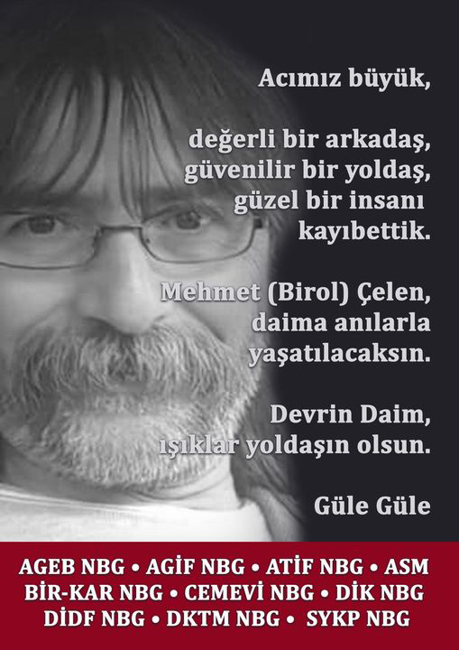 Mehmet Çelen ( Birol) u kaybetmenin üzüntüsü içerisinde olan tüm devrimci-demokratik kurumlar, dostları ve iş arkadaşları bugün AKM Cemevinde bir araya gelerek hem Birol`u andılar hem de Nürnberg`de kan bağından hiç kimsesi bulunmayan BİROL`a sahip çıkarak yoldaşlık duygularıyla Onu son yolculuğuna nasıl uğurlayacaklarını planladılar.