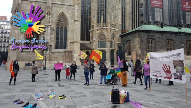 VİYANA : Viyana Kadın Dayanışması olarak 1 Mayıs’ta Hamburg’ta ayrıldığı eşi tarafından, iki çocuğuyla birlikte katledilmek istenen Mesude Şahin ve 02 Mayıs günü yine eşi tarafından Kassel’de katledilen Ahmad ve bildiğimiz/ bilmediğimiz erkek şiddetiyle katledilen bütün kadınların sesi olabilmek üzere Viyana meydanında biraraya gelen kadın örgütleri hep birlikte öfkelerini haykırdılar… Yapılan konuşmalarda Corvid 19 ile birlikte toplumun evlere kapandığı Avurpa’da, artan kadına yönelik şiddet ve kadın katliamlarının egemen sistem tarafından beslendiğine dikkat çekildi.