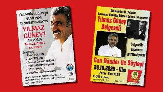 Devrimci sanatçı Yılmaz Güney, aramızdan ayrılışının 41. yılında Almanya’nın iki kentinde yapılacak etkinliklerle anılacak. İlk etkinlik 25 Ekim 2025 Cumartesi günü saat 18.00’de Nürnberg Südpunkt Kültür Merkezi’nde gerçekleşecek. Programda sanatçı Deniz Türkan, gazeteci-yazar Can Dündar, Diyalog Çocuk Folklor Topluluğu ve Avrupa Türkiyeli İşçiler Federasyonu (ATİF) temsilcisi yer alıyor. Etkinlikte ayrıca Yılmaz Güney’in yaşamı ve mücadelesine odaklanan belgesel gösterilecek. Dost kurum temsilcilerinin de katılım göstereceği anmanın bilet fiyatı 15 Euro.