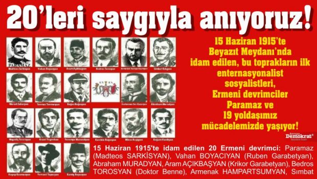 15 Haziran 1915’te Beyazıt Meydanı’nda idam edilen, bu toprakların ilk enternasyonalist sosyalistleri, Ermeni devrimciler Paramaz ve 19 yoldaşımız mücadelemizde yaşıyor!