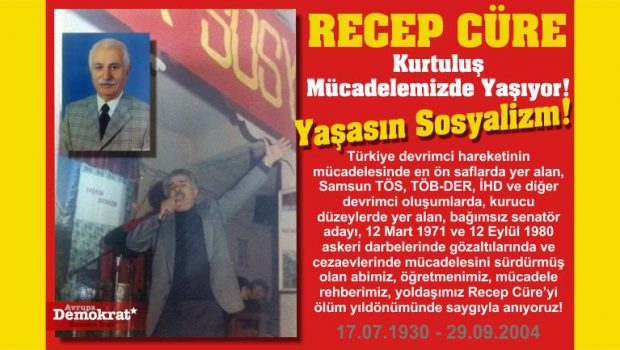 Türkiye devrimci hareketinin mücadelesinde en ön saflarda yer alan, Samsun TÖS, TÖB-DER, İHD ve diğer devrimci oluşumlarda, kurucu düzeylerde yer alan, bağımsız senatör adayı, 12 Mart 1971 ve 12 Eylül 1980 askeri darbelerinde gözaltılarında ve cezaevlerinde mücadelesini sürdürmüş olan abimiz, öğretmenimiz, mücadele rehberimiz, yoldaşımız Recep Cüre’yi ölüm yıldönümünde saygıyla anıyoruz!