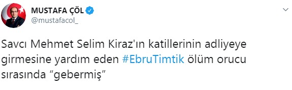 Çöl, sosyal medya hesabından, “Savcı Mehmet Selim Kiraz’ın katillerinin adliyeye girmesine yardım eden #EbruTimtik ölüm orucu sırasında “gebermiş” ifadelerini paylaştı.