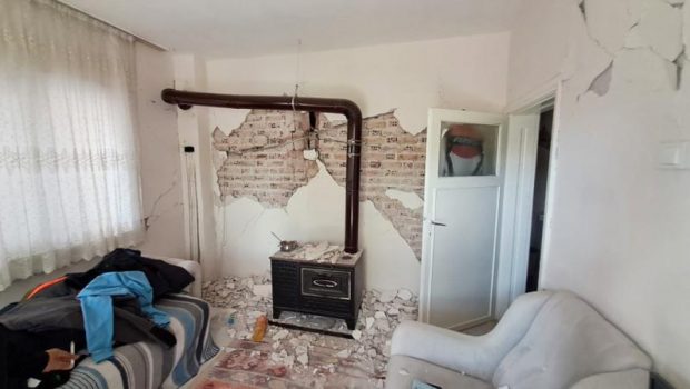 Evin içinde kapıların üstleri ve pencerelerin kenarlarının tamamı çatlak durumda. Duvara sabitlenmiş dolaplar yerlerinden çıkıp öne doğru gelmiş. Çatlaklar sadece ev içinden değil, bina dışından da görülebilir durumda. Banyodaki fayanslar dışa doğru patlamış, aşağı düşmüş.