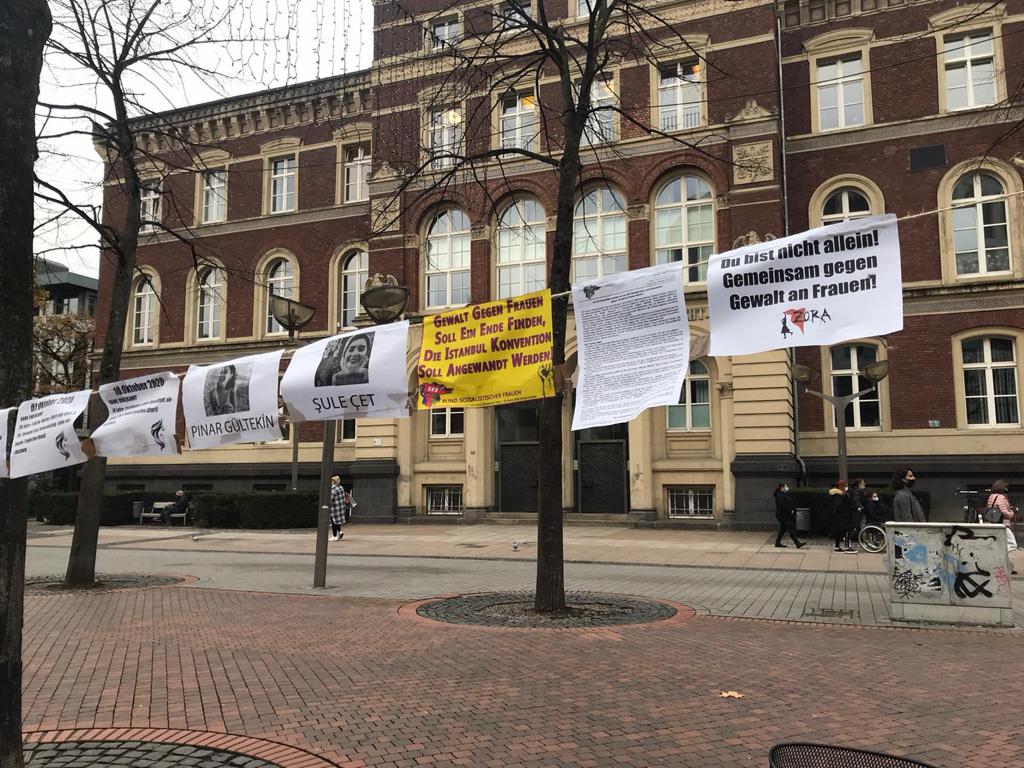 Nurnberg de ise göçmenlerin yoğun yaşadığı Gestenhof bölgesinde Fürtherst’de afiş çalışması yapıldı. Ardından ise mumlar yakılıp, kırmızı ayakkabı bırakılarak yapılan eylemde, kadına yönelik şiddete dikkat çekildi.