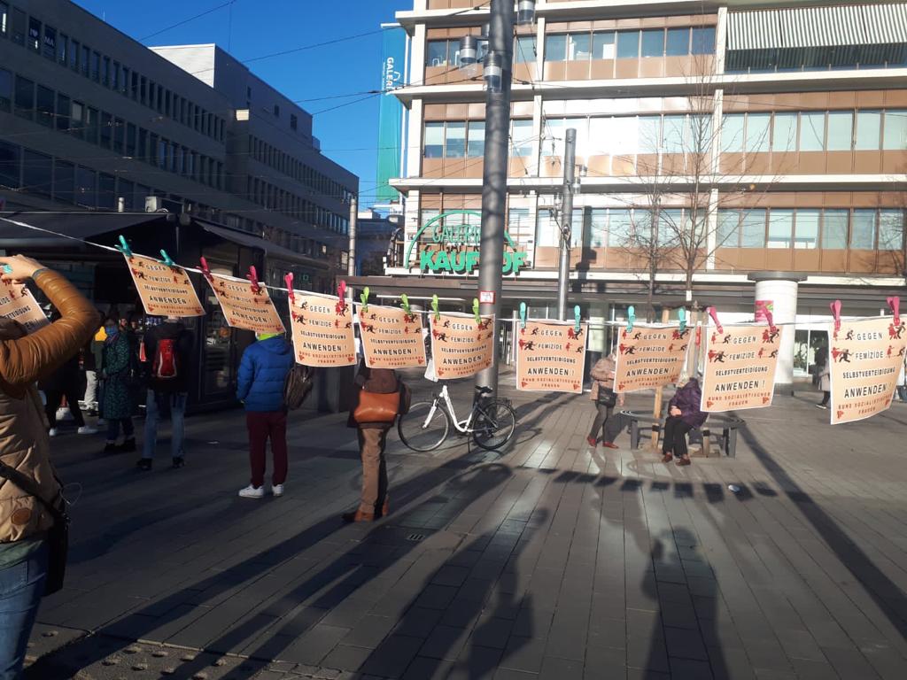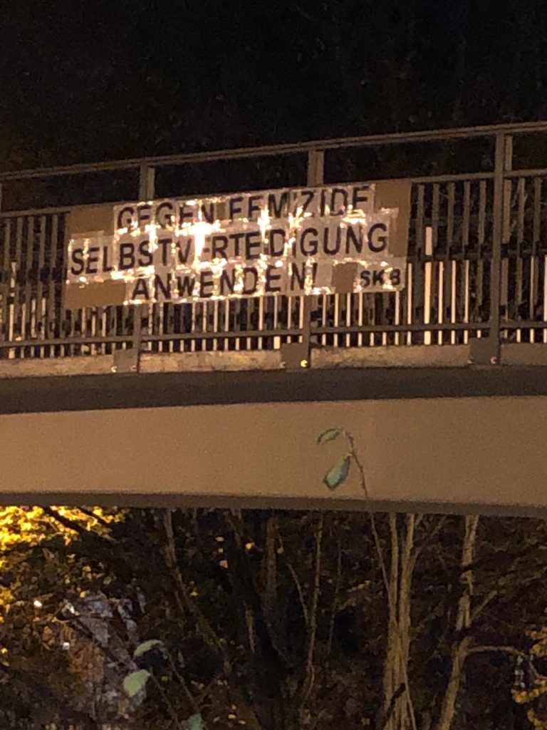 Nürnberg de Luipolhain parkın bulunduğu işlek caddedeki üst geçide Almanca, “Kadın katliamlarına karşı özsavunmaya” dövizleri asan kadınlar, meydana da “Erkeğin psikolojisi bozuk dediniz ceza indirimi verdiniz, istanbul sözleşmesini uygula” dövizleri bıraktı.