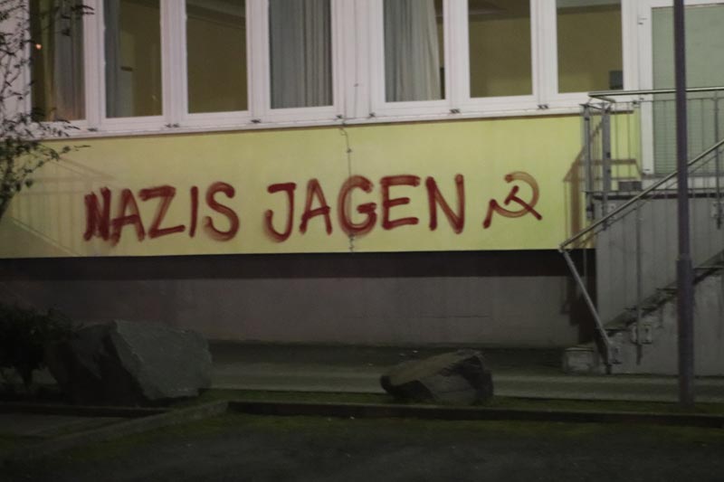 Frankfurt-Enkheim’deki “Mediterran Restoranı”, yeni faşist parti AfD’nin sıkça buluşmalarını yaptığı bilinen bir mekandır. 18-19 Şubat 2025 gecesi, Paris’teki saldırının üç gün sonrasında ve Hanau’daki ırkçı terör saldırısının beşinci yılında, komünist gençler bu restoranı ziyaret etti ve “Faşistleri kov” ve “AfD’yi sınır dışı et” sloganlarını bıraktı.